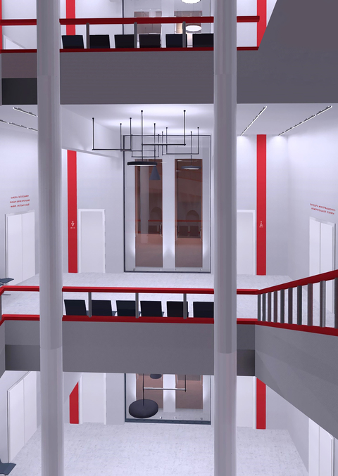 Композиционным центром холла между этажами являются патерностеры. Лифты давно не используются, но также составляют часть архитектурного наследия здания. По этой причине было принято решение закрыть нишу стеклянной перегородкой, сделав шахту с лифтами элементом исторической экспозиции. Свет в холле поделен на две части: общее освещение и акцентная группа из черных светильников FLOS