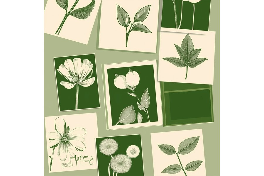 PROMT: A fashionable photo, a girl in a spacious sweatshirt. The sweatshirt is decorated with a pattern of the natural tea brand in a minimalist style. The background is green and white