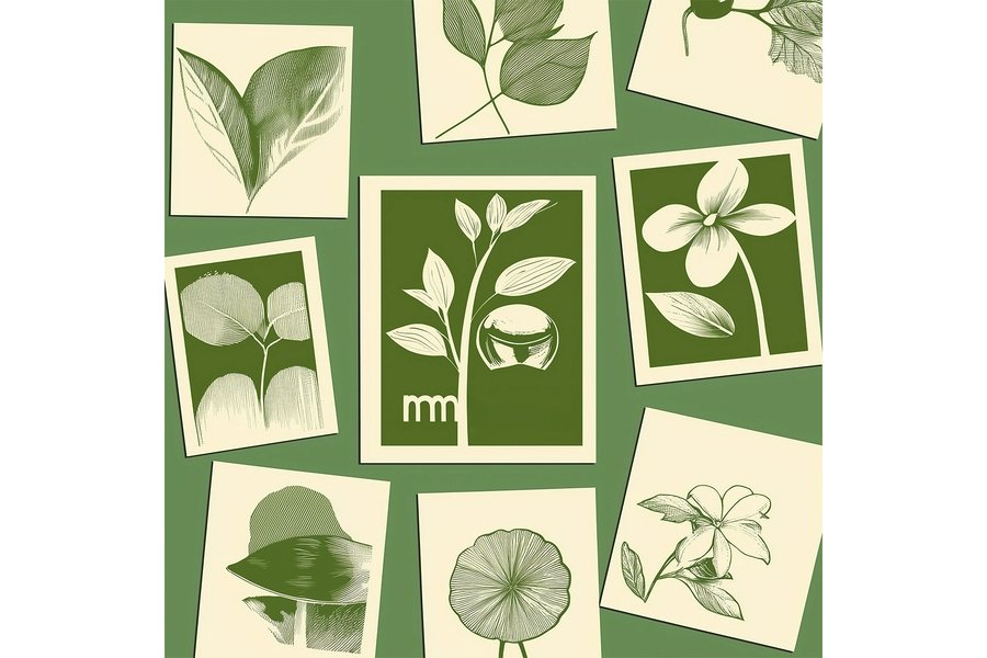 PROMT: Create a layout of printed products (paper, envelope, business cards) on a white background for a brand of natural tea called «mmytea» in a minimalist style using white and green colors