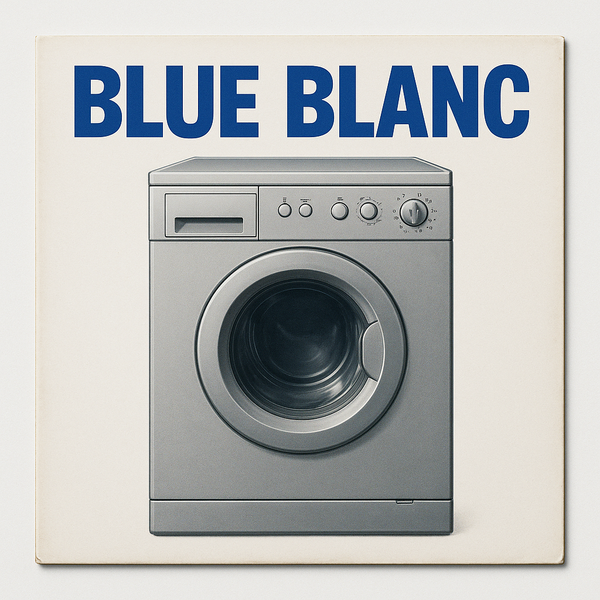 Minimalist vinyl record cover design on a white background. In the center, a detailed silver front-loading washing machine with metallic reflections and soft shadows. Above it, in bold blue text using DIN 2014 Bold font, the words «BLUE BLANC». Clean composition, centered layout, even lighting, high-resolution product photography style.