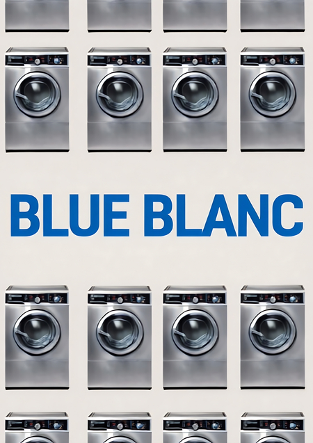 A minimalist conceptual poster for a modern laundry brand named BLUE BLANC. Repeated rows of sleek, metallic silver washing machines arranged in perfect grid symmetry. Centered bold blue text «BLUE BLANC» in clean sans-serif typography. Background in soft white or light neutral tone. Lighting is bright, diffused, and uniform — no harsh shadows. Atmosphere of silence, precision, and modern minimalism. The image should feel calm, structured, and visually balanced — a rhythm of order and purity. Aesthetic similar to contemporary art installation or brand identity campaign. 4K, ultra-clean, high contrast, photographic clarity.