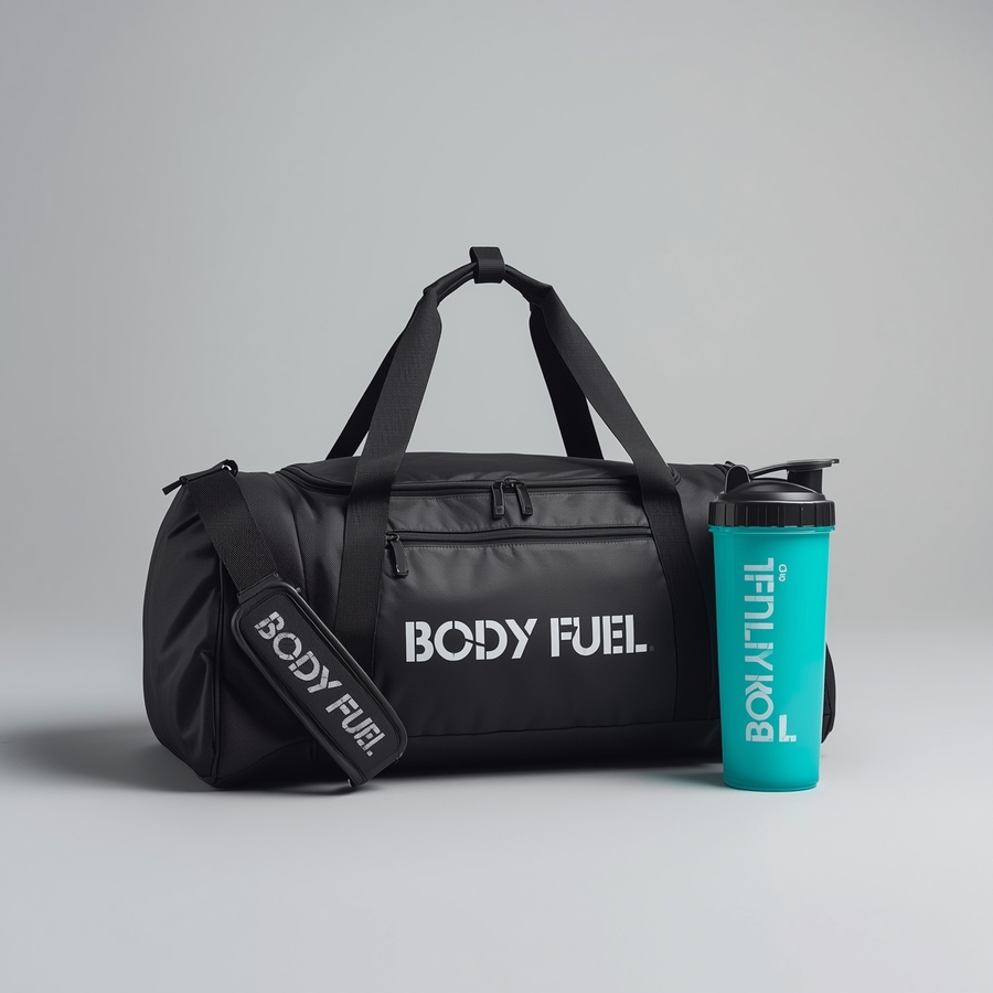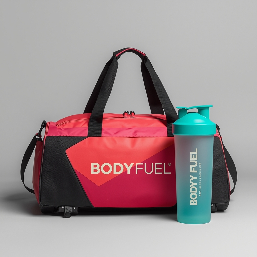 Промт: Professional product photography of a «Body Fuel» brand sports bag and matching shaker bottle, isolated on a clean, minimalist light grey background. The sports bag is a sleek, modern gym duffel with multiple compartments. The shaker bottle is a durable plastic blender bottle with a secure lid and flip-top spout. Branding: The «Body Fuel» logo is prominently and cleanly displayed on both items, the color of 'Body Fuel' is soft off-white (color F1E7E6). Use the exact color palette for the bag and bottle: a vibrant coral (color ED6267), a bold magenta (color EB2280), a fresh teal (color 07CA9E)). Style: Sharp focus, studio lighting with soft shadows, high detail, 8K resolution, commercial product shot. The composition should feel energetic and aspirational.
