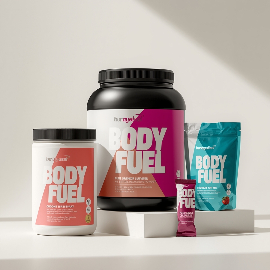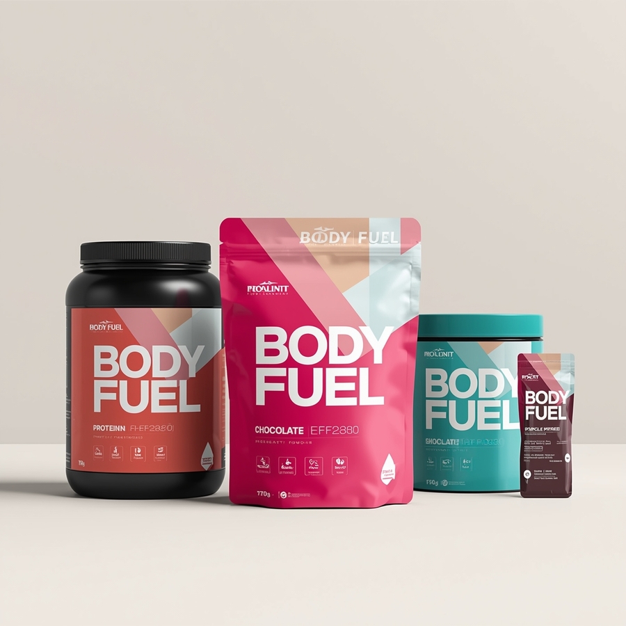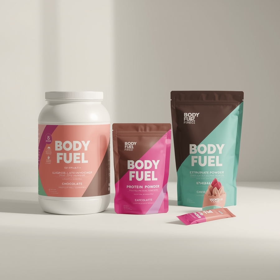 Промт: Professional product photography of a line of «Body Fuel» protein powder packaging. Show three distinct container types: a large, sturdy plastic tub with a wide mouth, a sleek, sealed foil pouch with a resealable zipper, and a single-serving packet. The containers are arranged on a clean, minimalist background in the brand’s soft off-white color (color F1E7E6).