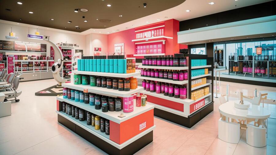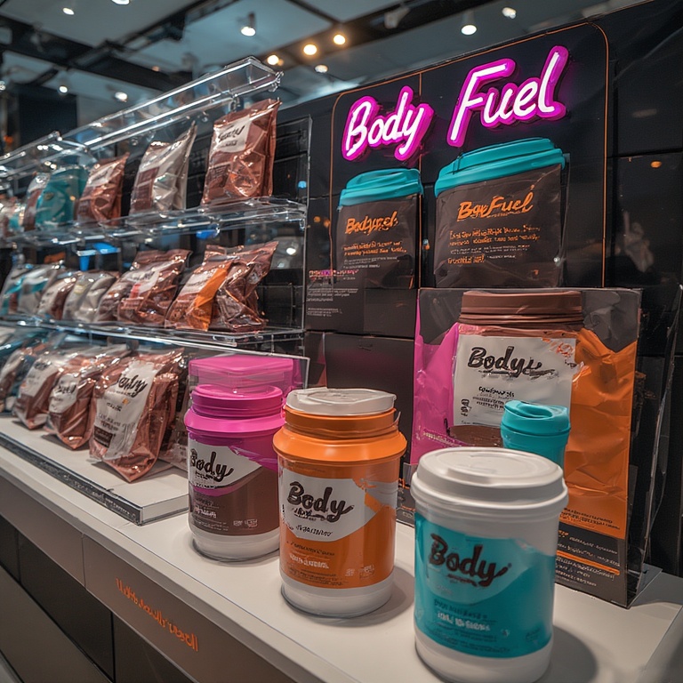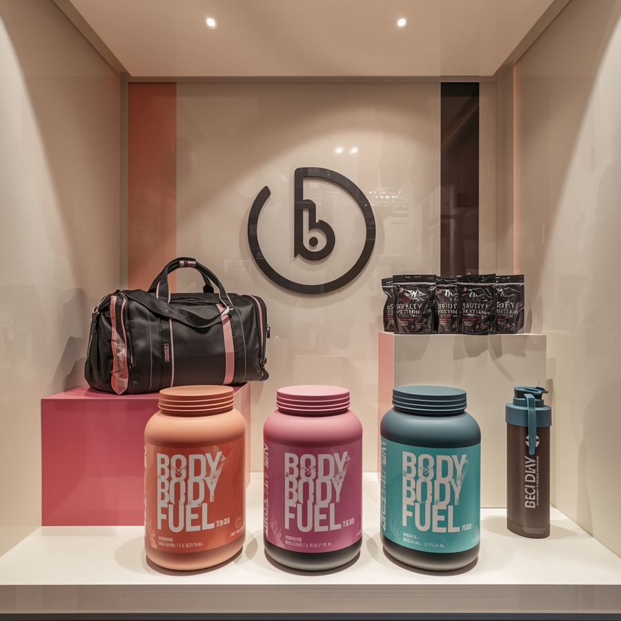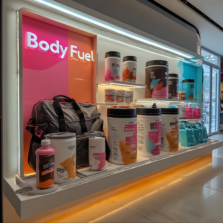 Промт: A hyper-realistic, wide-angle photograph of a modern, high-end product display case in a luxury shopping mall. The display is for the fitness brand 'Body Fuel' and is designed to be an immersive brand experience.