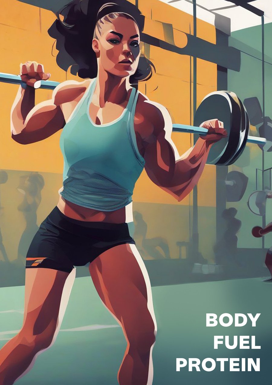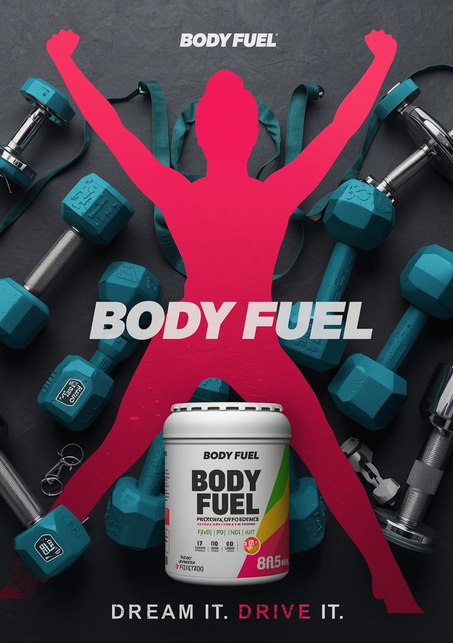 Промт 2: A bold, graphic-design style poster for «Body Fuel». The composition is a creative flat lay of fitness equipment arranged artistically. A set of hexagonal dumbbells is in the background, with a «Body Fuel» protein tub and shaker bottle in the foreground. Superimposed over the equipment in a dynamic pose is a silhouette of a female athlete doing a victory pose. Color Palette & Design: The color application is highly graphic. The athlete’s silhouette is filled with a vibrant gradient of Magenta (color EB2280) and Coral (color ED6267). The dumbbells are in Teal (color 07CA9E), and the protein packaging is in the off-white (color F1E7E6) with color accents. The background is a dark charcoal for maximum contrast. Text & Layout: The «Body Fuel» logo is large and central. A powerful, impactful tagline, «DON’T DREAM IT. DRIVE IT.», is integrated into the design.
