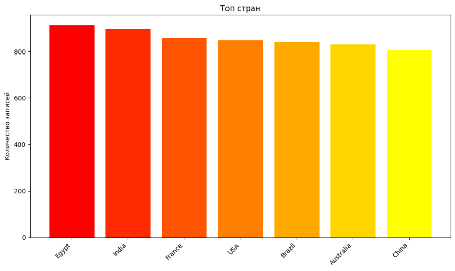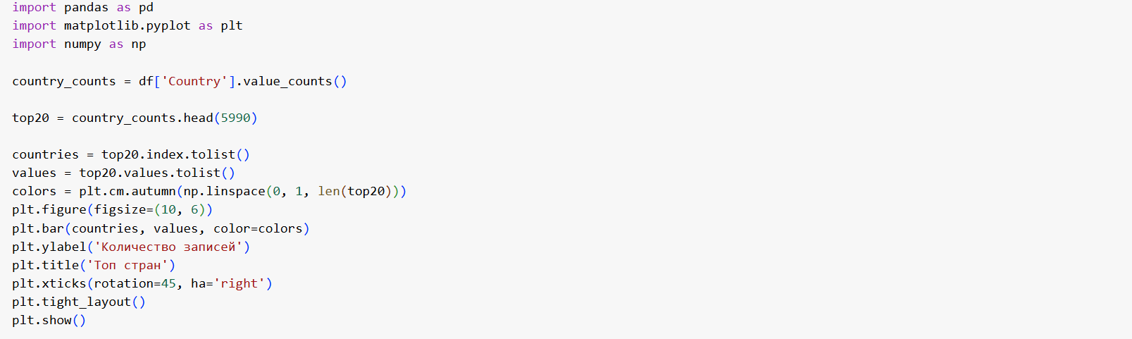 Первым делом я построила диаграмму, которая отражает топ стран, которые наиболее часто встречаются в выбранном мной датасете.