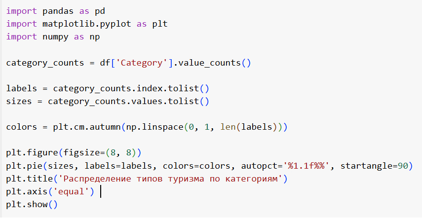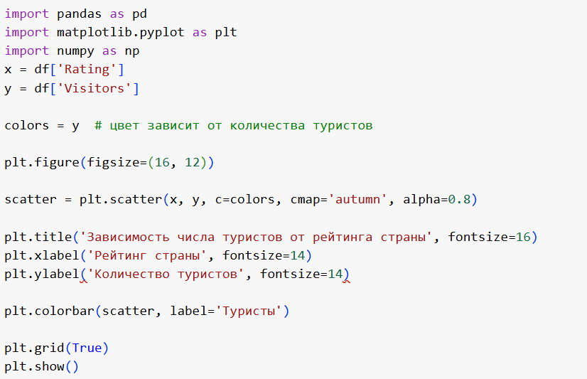 Визуализация данных с помощью Python, представленная на основе нескольких графиков и диаграмм, позволила получить глубокое и многогранное понимание исследуемого датасета о путешествиях. Круговая диаграмма, показывающая распределение категорий путешествий и стран, продемонстрировала почти равные доли всех категорий, что указывает на разнообразие туристических интересов и отсутствие явного доминирования одной категории. Это помогло увидеть общую структуру данных и равномерность предпочтений. Облако тегов с цветовой кодировкой дополнило анализ, визуально выделяя наиболее частые категории и страны, а также показывая связь между ними через цвет. Такой подход сделал данные более наглядными и позволил быстро идентифицировать ключевые направления и популярные категории для каждой страны. Диаграмма рассеяния, иллюстрирующая зависимость числа туристов от рейтинга страны, выявила положительную корреляцию между этими показателями, при этом показала и исключения, что говорит о влиянии дополнительных факторов на туристический поток. Это позволило оценить эффективность рейтингов и выявить области для дальнейшего изучения.