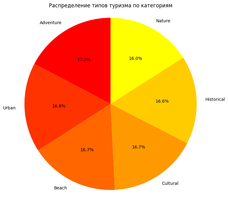 Круговая диаграмма, построенная по столбцам category и country, позволила быстро оценить распределение различных категорий путешествий среди стран в датасете. Визуализация показала, что доли всех категорий оказались почти одинаковыми, что указывает на равномерное распределение интересов путешественников по разным направлениям и типам отдыха. Такой результат говорит о том, что ни одна категория не доминирует, и туристические предпочтения достаточно разнообразны. Это важно для дальнейшего анализа: например, маркетинговые стратегии могут быть ориентированы сразу на несколько категорий, а не только на одну ведущую