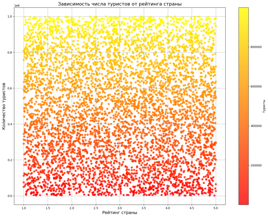 Построенная диаграмма рассеяния, показывающая зависимость числа туристов (Visitors) от рейтинга страны (Rating), позволила выявить важные взаимосвязи в данных о путешествиях. Анализ графика показал, что с ростом рейтинга страны, как правило, увеличивается и количество туристов, что подтверждает логику — более высокие рейтинги отражают лучшую туристическую инфраструктуру, привлекательность и качество сервиса, что привлекает больше посетителей