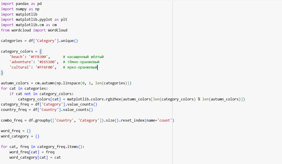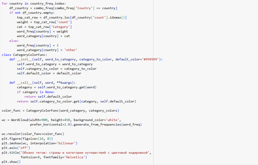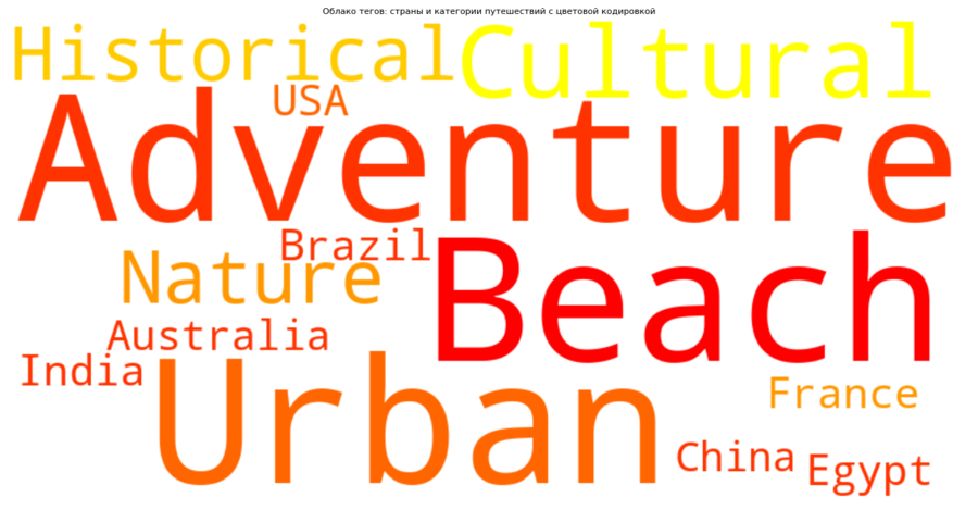 Облако тегов с цветовой кодировкой по столбцам category и country дополнило анализ датасета о путешествиях следующим образом: