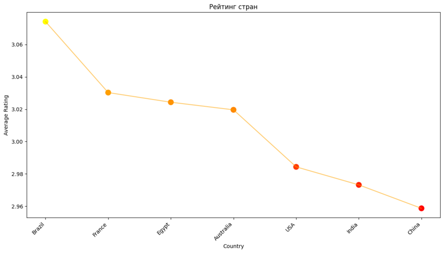 Построив линейную диаграмму, можно наглядно увидеть рейтинг стран. Из него становится ясно, что самым высоким рейтингом среди туристов обладает Бразилия. Китай, наоборот, в данной выборке отличается достаточно низким рейтингом, что составляет оценку в значение ниже 3