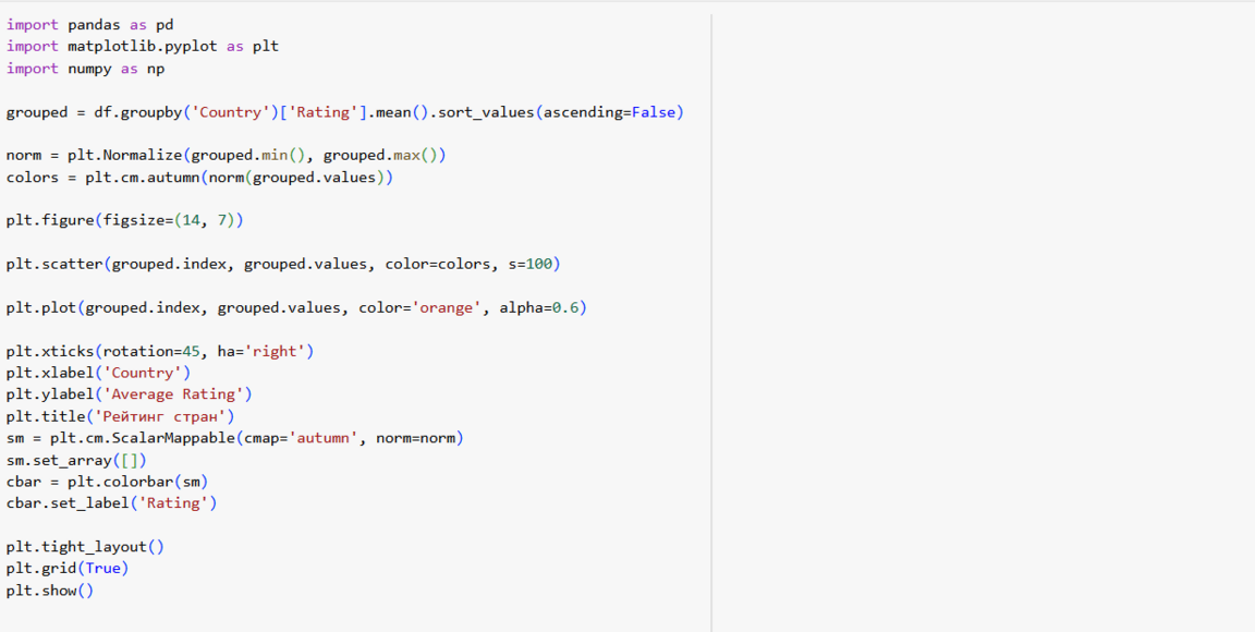 Таким образом Python как инструмент визуализации данных играет ключевую роль в анализе благодаря своей гибкости, богатству библиотек (Matplotlib, Seaborn др.) и интеграции с аналитическими инструментами. Он позволяет быстро создавать графики, что облегчает понимание сложных взаимосвязей