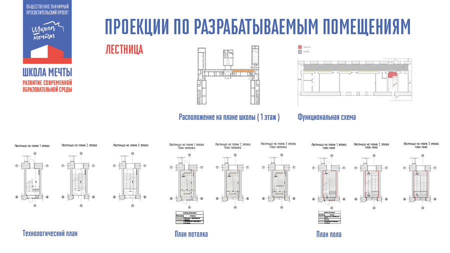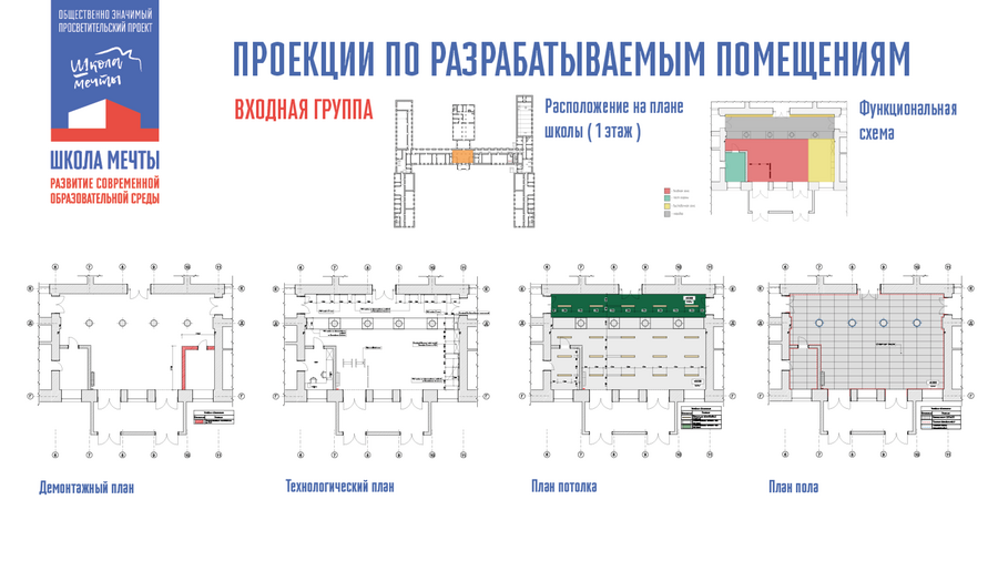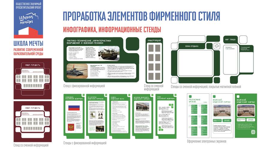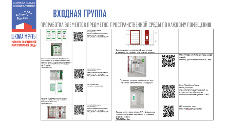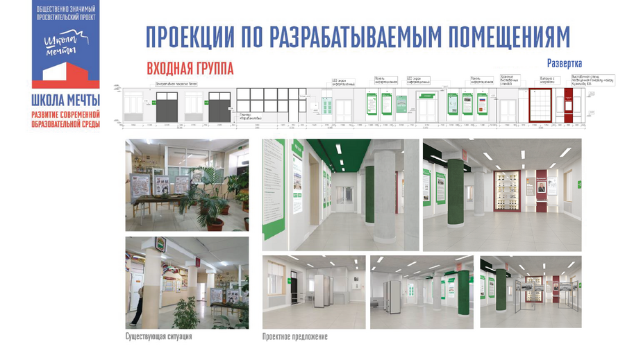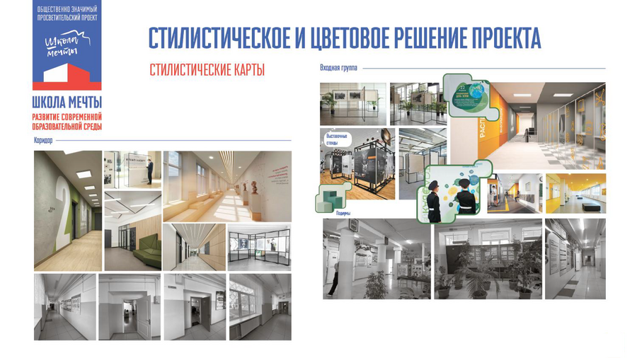 ВХОДНАЯ ГРУППА, ХОЛЛ, 1 этаж Входная группа и холл в школе — это пространство, в которое мы попадаем в самую первую очередь, поэтому оно должно иметь не только презентационную, но и информационную функции. Зонирование данного помещения осуществлялось исходя из функционала и пожеланий заказчиков, выявленных на соучаствующем исследовании. Главным пожеланием была отмечена организация выставочной зоны без препятствия основным путям передвижения. Вся размещённая в холле информация была проанализирована и поделена на блоки: Информацию предлагается размещать на двух видах носителей: интерактивные LED экраны и панели с фиксированной информацией Так как в холле постоянно проходят выставки с разной информационной подачей нами предложены для этой цели сборно-разборные модульные выставочные конструкции, которые являются мобильными, их можно собрать и разобрать при необходимости. Для них предусмотрено место хранения, расположенное слева от витрин с наградами. В соответствии с общей концепцией проекта практически во всех разрабатываемых пространствах кадетского корпуса, применяется зонирование цветом.