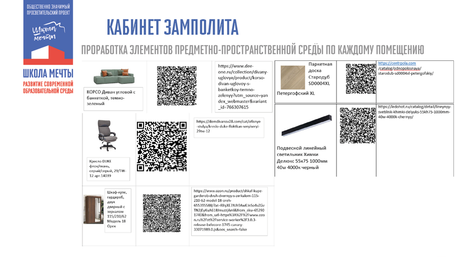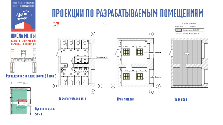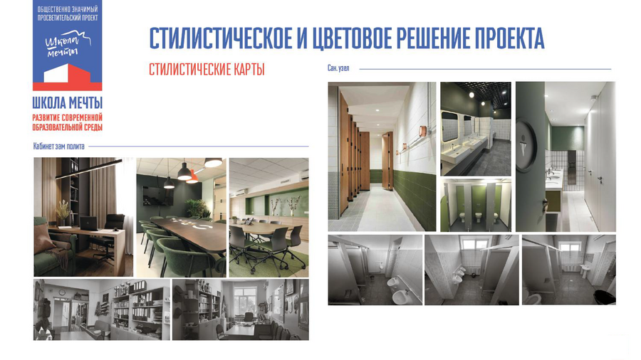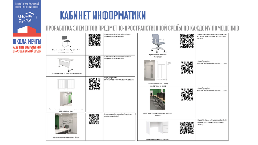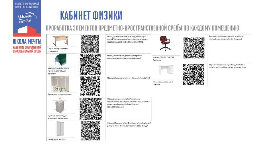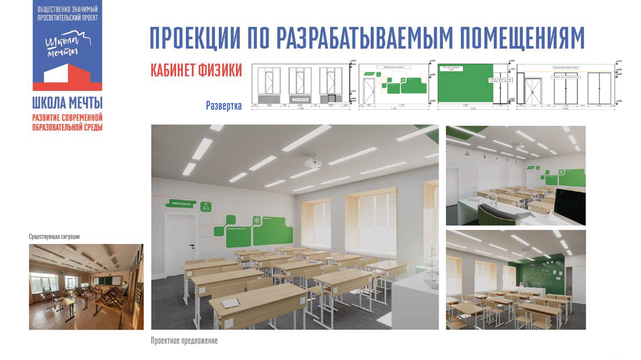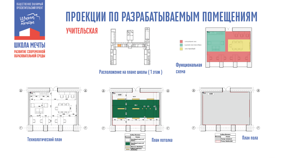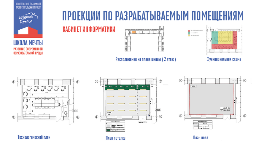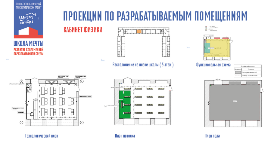 Кабинет также делится на несколько функциональных зон: 1-я: рабочая зона учителя 2я: практическая зона с лабораторными партами 3-я: зона хранения материалов и оборудования В конце кабинета также применяется фирменная графика, которая выполнена из магнитно-маркерной пленки для размещения на ней информации, которая может при необходимости легко меняться.