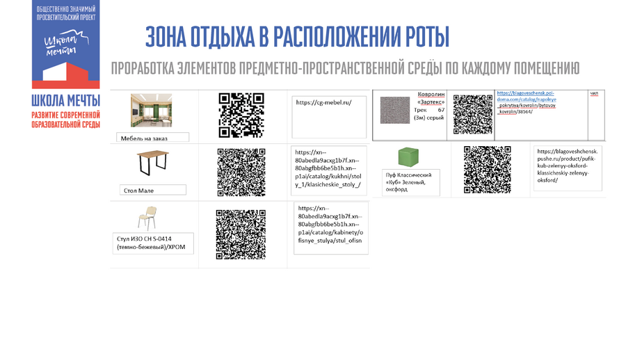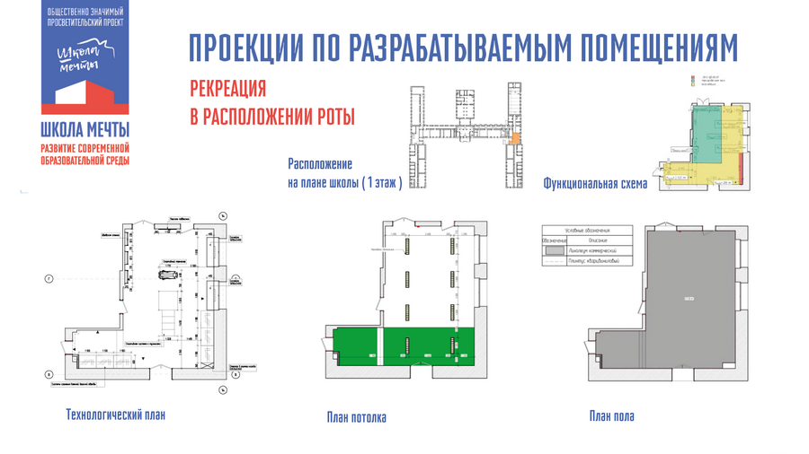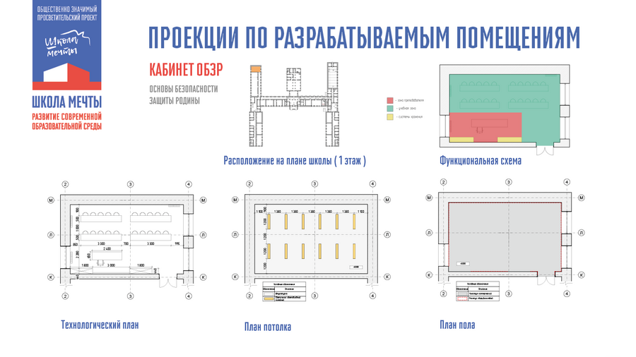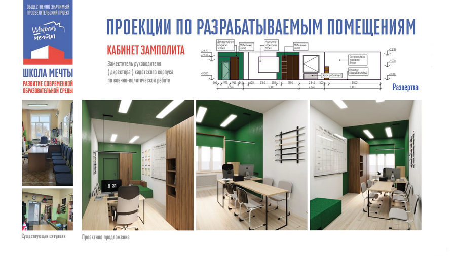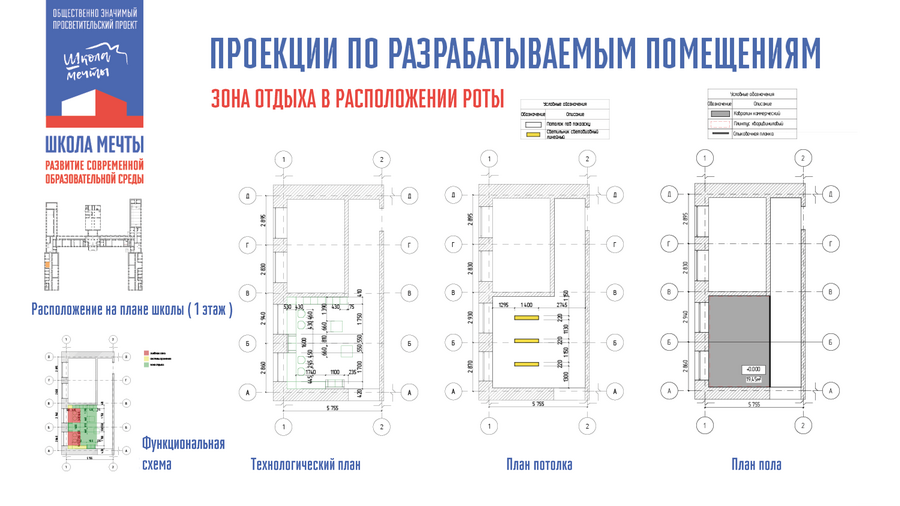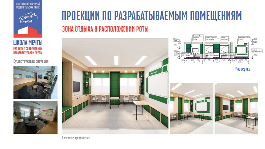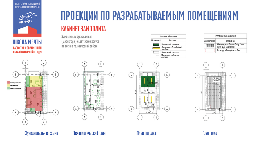 Основные функциональные зоны: зона отдыха, рабочая зона и зона хранения. Данные зоны и размещенное в них оборудование были спроектированы исходя из запросов руководителей и учащихся кадетского корпуса.