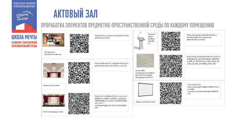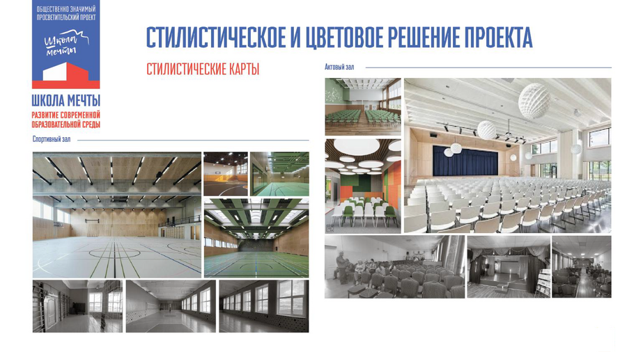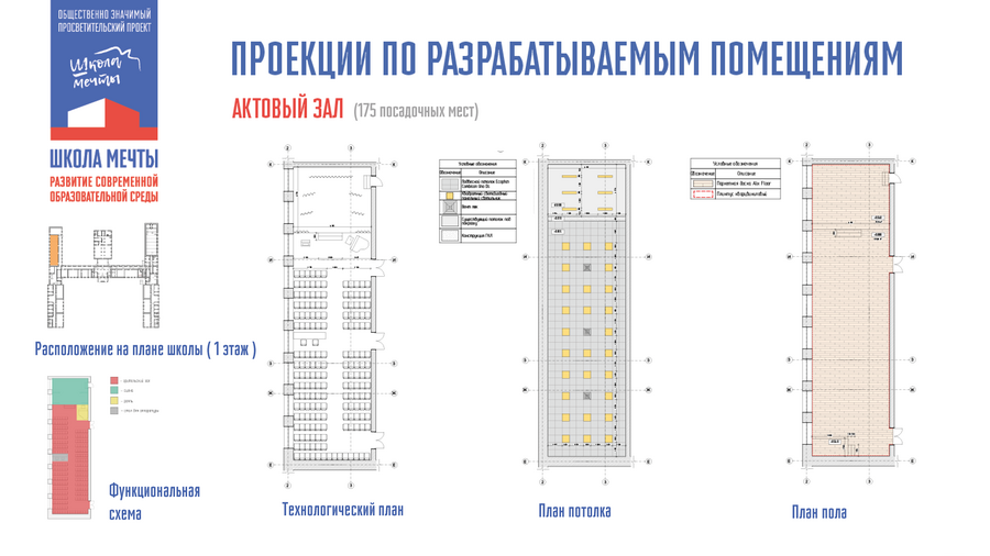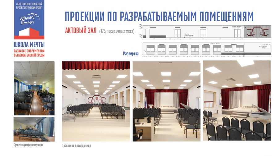АКТОВЫЙ ЗАЛ В каждой школе есть пространство для общешкольных собраний и мероприятий — актовый зал. Для Амурского кадетского корпуса оно имеет особое значение, так как там проводится очень много мероприятий военно-патриотической направленности, поэтому предложено подчеркнуть эту направленность и сделать его интерьер в торжественно-парадном стиле. В интерьере преобладает белый цвет и введены бордовые акценты — занавес на сцене, кант на рулонных шторах, и графика на задней стене.