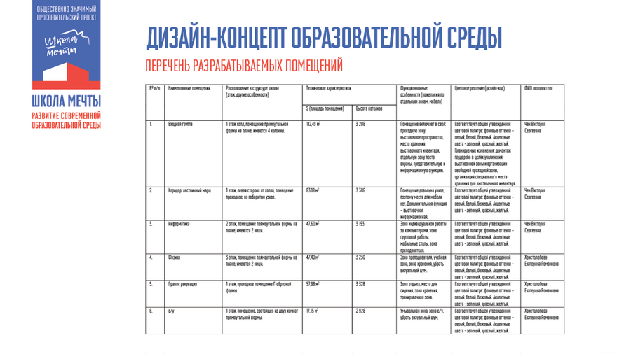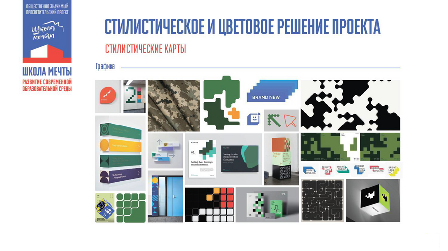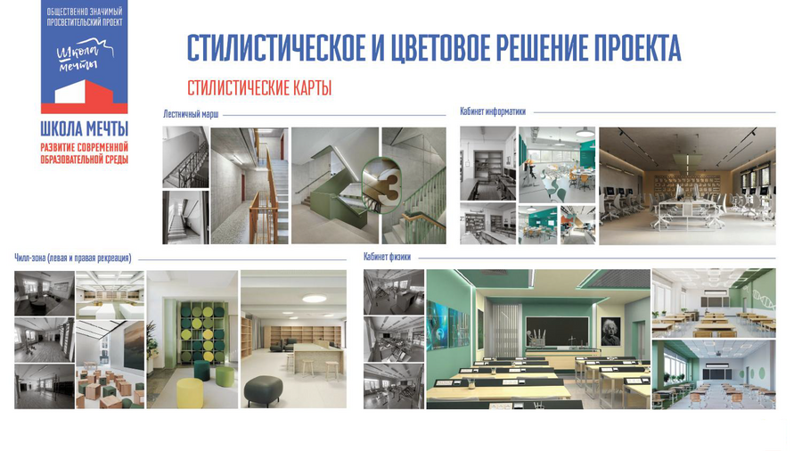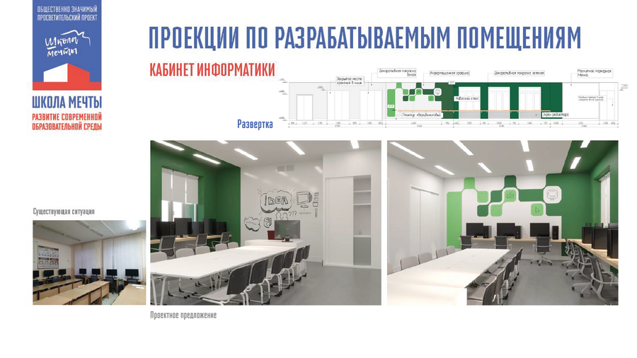 В помещении предлагается организовать три зоны: 1-я: рабочая зона учителя 2я: практическая зона с компьютерами по периметру двух стен, оставить так, как они расположены сейчас, но выделить эту зону цветом и настенной графикой; 3-я: мобильная теоретическая зона в центральной части кабинета — там предлагается разместить легкую мобильную учебную мебель, которую в зависимости от задач образовательного процесса можно будет по-разному расставить (на визуализации представлен вариант с одним общим столом) В кабинете применяется фирменная графика.