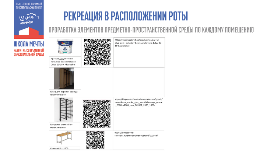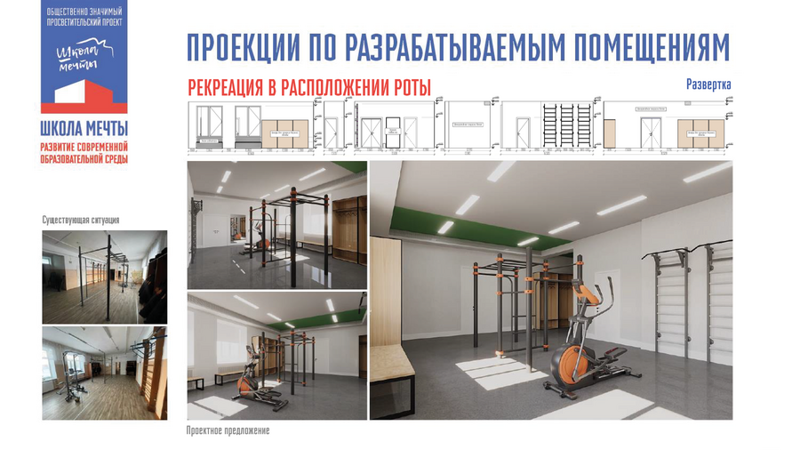 В спортивно-досуговой зоне располагаются турники, шведские стенки и тренажеры. Зона отдыха является условной в виде скамеек Зона хранения верхней одежды: так как рекреация располагается на первом этаже и имеет выход на улицу, для кадетов организована специализированная открытая система хранения, со специальными полками для хранения всей верхней одежды, шапок и обуви. Данная зона выделена цветом на потолке.