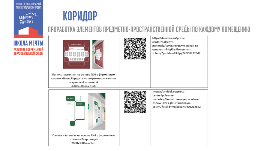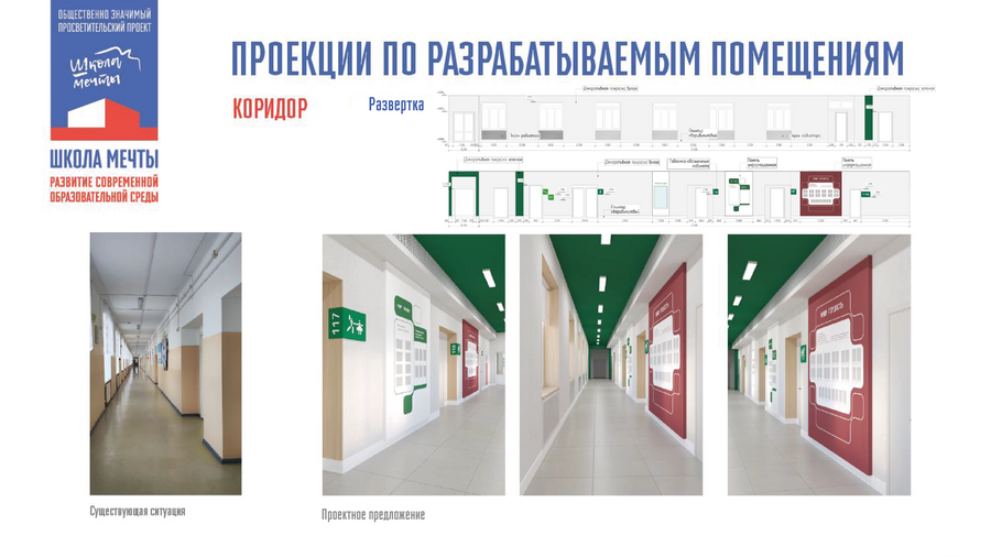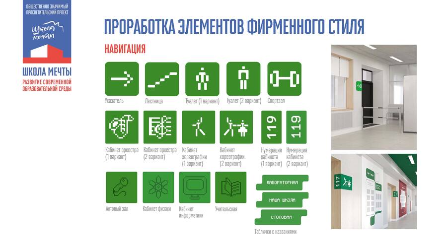 В качестве обозначения кабинетов графическим дизайнером команды разработаны специальные носители — они достаточно лаконичны и не перегружают и без того наполненный информацией коридор. Коммуникации, создающие большой визуальный шум, предлагается спрятать в короб, закрытый решеткой, которая легко снимается, для осуществления доступа к ним.