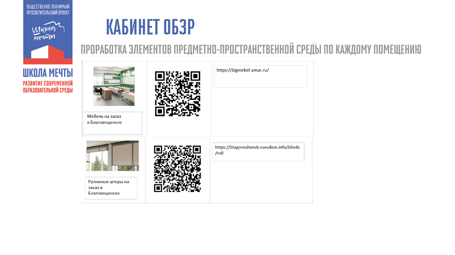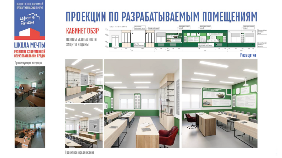 В целях организации специфических образовательных процессов, связанных с изучением различных видов оружия и средств защиты предложено оборудовать кабинет специально разработанной для него учебной мебелью, которая будет изготовлена на заказ. В кабинете также применяется фирменная графика, которая выполнена из магнитно-маркерной пленки для размещения на ней информации, которая может меняться.