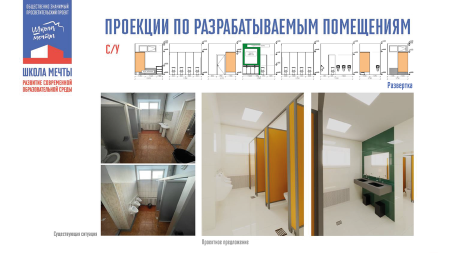 В санузле организованы кабинки, которые выполнены по требованиям данного учебного заведения, они представляют собой разделительные перегородки без дверей. Мы предложили выделить их ярким оранжевым цветом, а зону с раковинами зеленой кафельной плиткой.