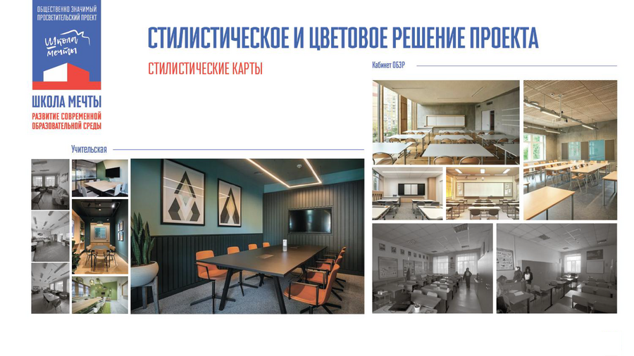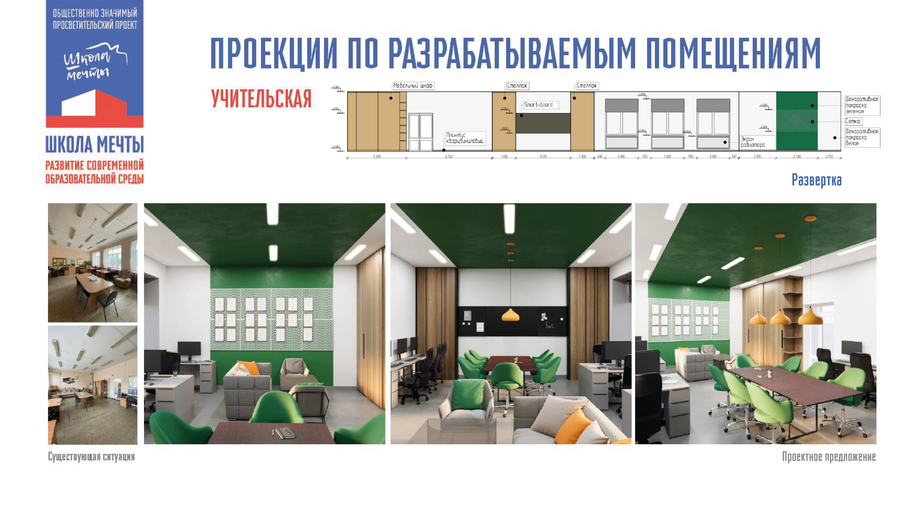 УЧИТЕЛЬСКАЯ В помещении предусмотрено несколько функциональных зон для комфортного пребывания педагогов: 1. Индивидуальные рабочие места 2. Общий рабочий стол для совещаний 3. Зона отдыха 4. Скрытая мини-кухня 5. Системы хранения