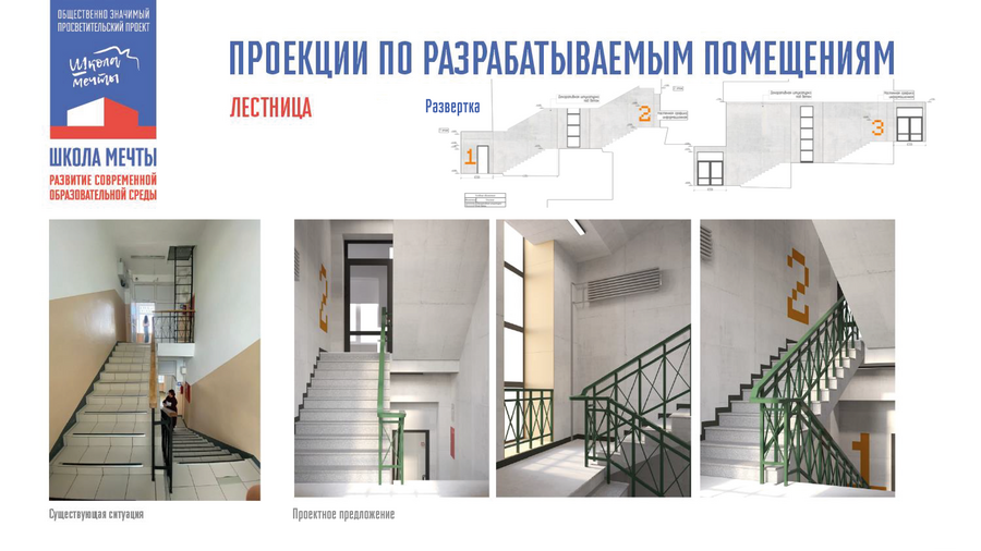 ЛЕСТНИЧНЫЙ МАРШ Главная функция лестницы — быть достаточно удобной и безопасной для ежедневного использования. Дизайн лестницы лаконичный, светлый. В качестве покрытия стен используется декоративная штукатурка под бетон. Также применяется инфографика в фирменном стиле в обозначении этажей.