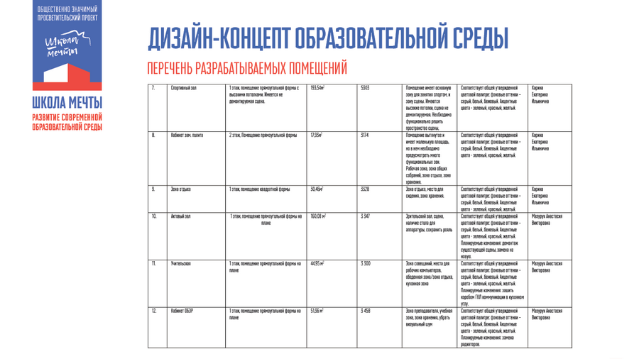 Справа при входе в помещение расположена скрытая система хранения для верхней одежды и блок мини-кухни. В этой же зоне организовано место отдыха: диван, два кресла и стол. Индивидуальные рабочие места расположены вдоль стены с окнами и в левой части от входа. Там же, напротив зоны отдыха находится общий рабочий стол для совещаний. Поэтому было решено выделить эту зону цветом на потолке в соответствии с общим концептуальным решением проекта. Кабинет оборудован интерактивной доской и специальной выставочной зоной (фетровая или сетчатая поверхность) для размещения методического материала и различной сменной информации.