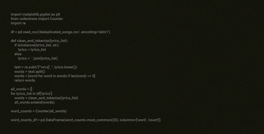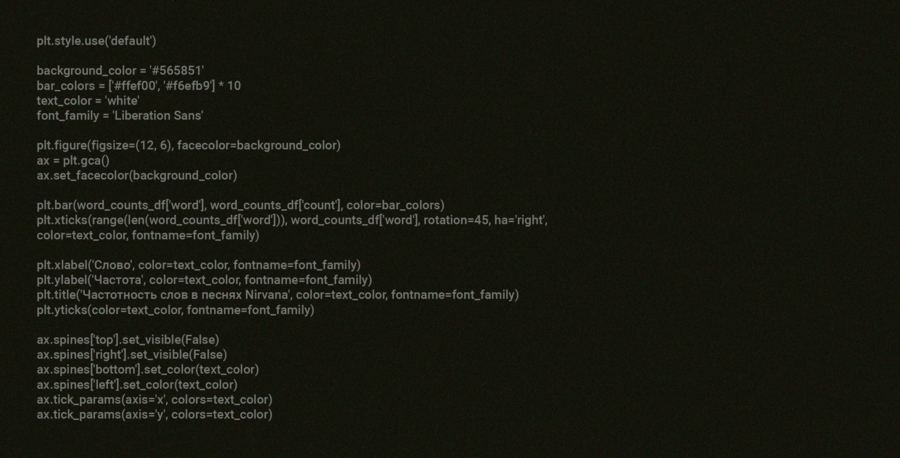Первый график — стандартная гистограмма частотности слов, которые встречаются в песнях Nirvana. В базе данных тексты представлены в виде списка строк, так что сначала я провожу очистку и токенизацию текста, разбивая его на слова. Все слова я перевожу в нижний регистр и удаляю пунктуацию (это привело к тому, что слова с апострофами внутри остались без апострофов, но я предпочла этот вариант наличию лишних верхних одиночных кавычек в начале или конце слова). Я добавила фильтрацию по длине слова, чтобы избежать результата исключительно в виде самых частоупотребимых слов по типу личных местоимений и предлогов.