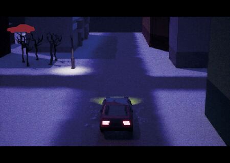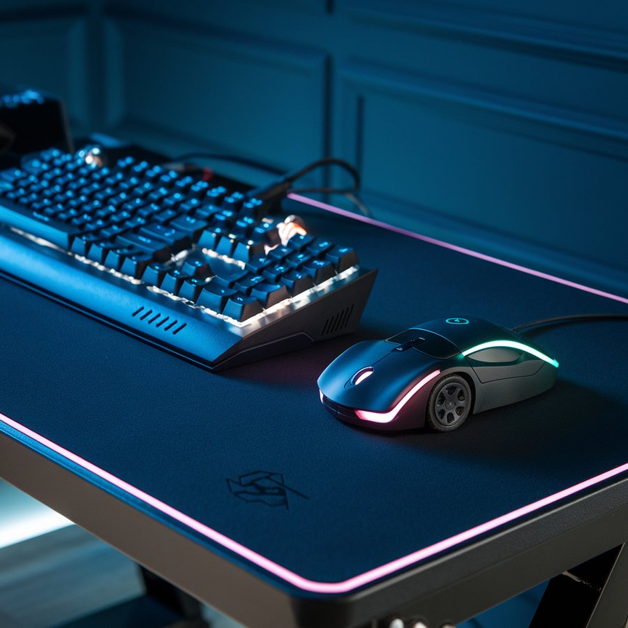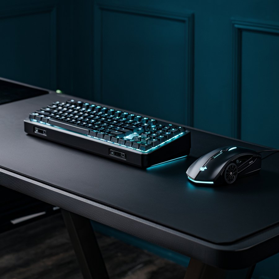 Prompt: an image of a keyboard and mouse standing on a gaming table. The table has a matte black color. The keyboard is designed in the style of a bumper car. The mouse looks like a small sports car. The keyboard and mouse also have a small backlight. A room with dark blue walls is depicted in the background. The lighting is soft.