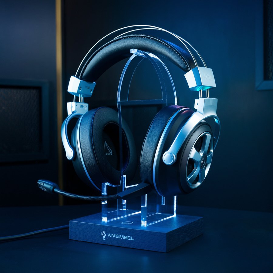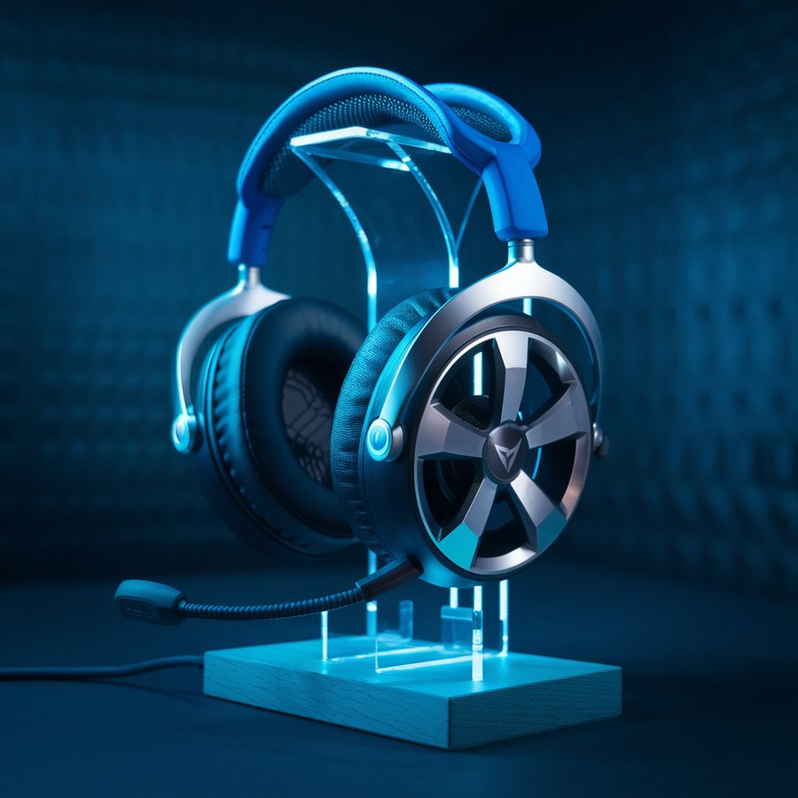 Prompt: an image of gaming headphones standing on a stand. The stand has a dark blue color. The headphones are made in the style of car wheels. The headphones also have a small backlight and a microphone. In the background is a room with dark walls. The lighting is soft.