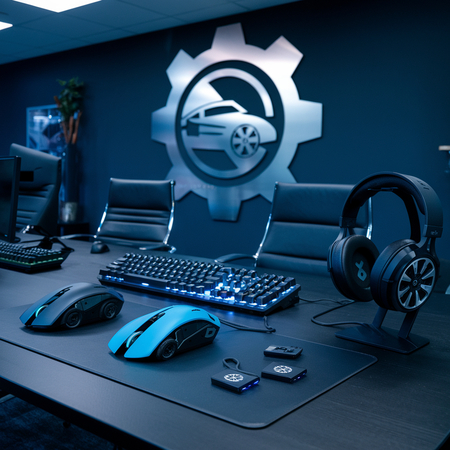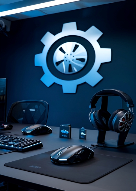 Prompt: an image of the company’s office with a black matte table in the middle. There are computer gaming mice, gaming keyboards, gaming headphones and flash drives on the table. Computer mice look like small sports cars. The keyboards are made in a minimalistic design and resemble car headlights. The headphones are made in the style of car wheels. The flash drives show a logo in the form of a gear, inside which is a disk from the car. The office is decorated in dark blue. There is also a huge logo in the form of a gear on the wall, inside which is a disc from a car.