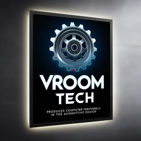 Prompt: a futuristic advertising poster for Vroom tech, a company producing computer peripherals in automotive design, featuring a stylized logo with a picture of a gear in the form of a car wheel and bold white glowing letters, placed at the top center of the poster.
