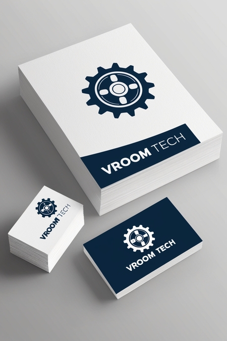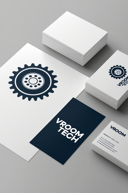 Prompt: a set of printed materials, consisting of a crisp white paper and a stack of business cards. Vector logo in the form of a gear, inside which is a disc from a car. The logo also has the inscription «Vroom tech» in bold white letters. The logo color is dark blue.
