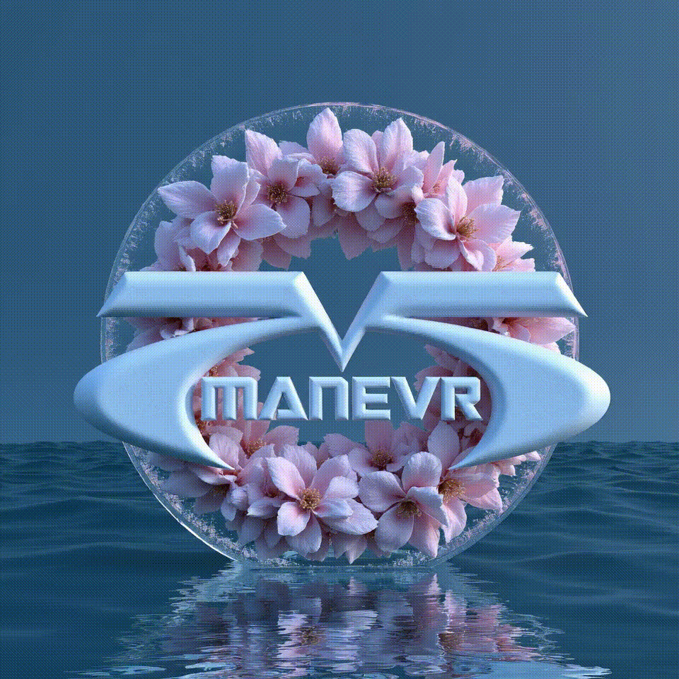 /promt: the logomanevr translucent and icy, add orchids, peonies and roses to it, delicate shades that wrap around the sign itself. The background should be dawn in a field of color with a view of the ocean in blue, it should be an octane render, the lighting is an imitation of the sun and because of the icy material of the logo, a play of light occurs