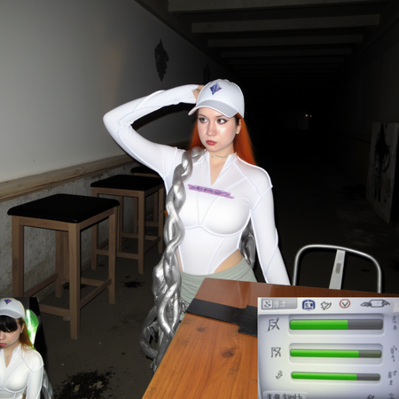 /promt: A red-haired girl in a white skin-tight bodysuit stands in a mysterious, semi-dark basement. The atmosphere is tense, the lighting dramatic — cold blue light on one side, warm reddish on the other, symbolizing the choice between life and death. There are blurred silhouettes of doors against the background: one leads to the light, the other into the dark abyss. A light mist spreads across the floor, creating a mystical atmosphere. The graphics are in the style of The Sims game, but with a more cinematic and detailed rendering.