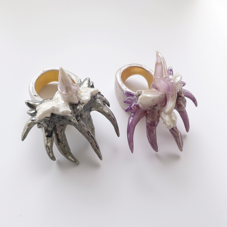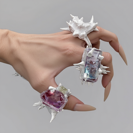 /promt: A distorted ring with spikes, protrusions, and different textures: mother-of-pearl, silver in the Castle core style, the base is made of transparent plastic with colored tints, worn on the fingers of a pale hand with long horor nails. Cold lighting realistic 3d octane rendering