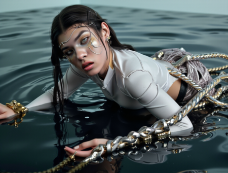 /promt: The girl is standing knee—deep in dark water, her white bodysuit hugs her body, emphasizing her curves, and massive gold jewelry of ancient tribes shine on her skin — heavy bracelets, hoops on her arms and legs, an intricate necklace, like an artifact from the past. The water around her is restless: dozens of snakes glide across the surface, their dark bodies writhing, glistening in the dim light. Some are already starting to rise, wrapping around her legs, sliding along her hips, approaching her waist. But she doesn’t move, her gaze is calm, fascinatingly cold, as if this is part of an ancient ritual or she herself is the mistress of snakes. The atmosphere is tense, mystical, with a sense of inevitability.