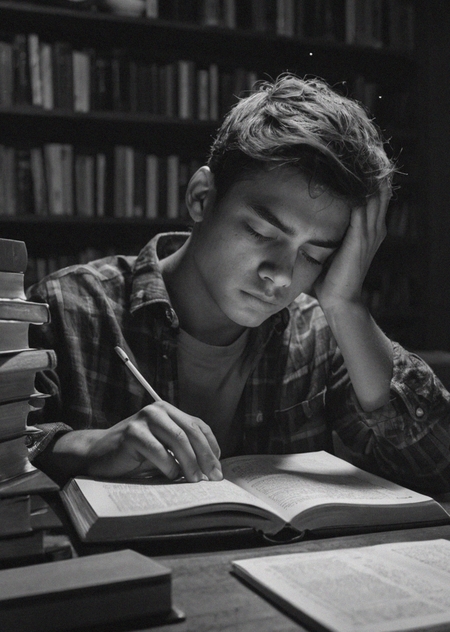 Обложка была сгенерирована с помощью генеративной сети Leonardo.Ai [2], а после обрабона в растровом графическом редакторе Krita. Текст промпта: a stressed student sits at his desk at night and reads textbooks, notebooks are scattered around.
