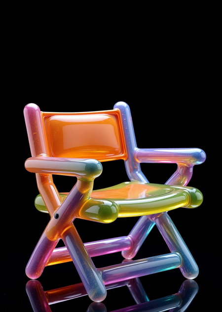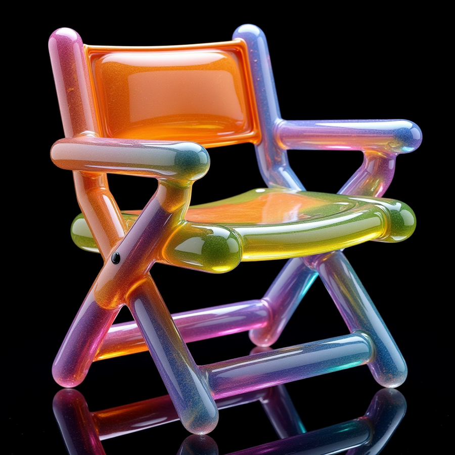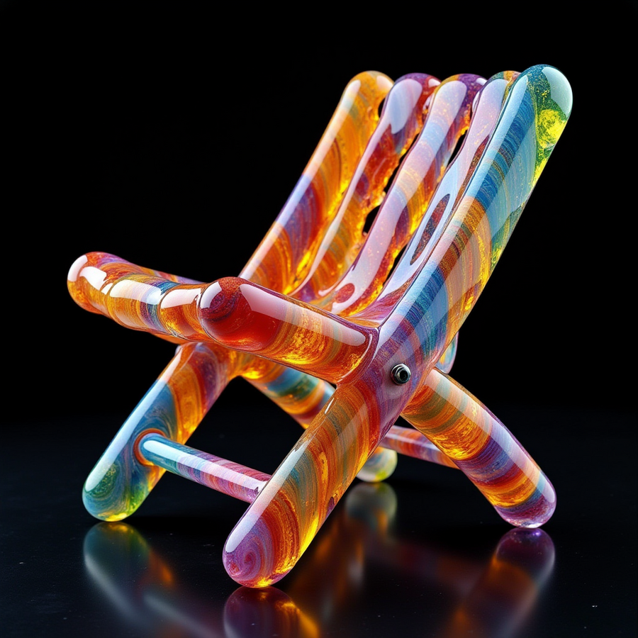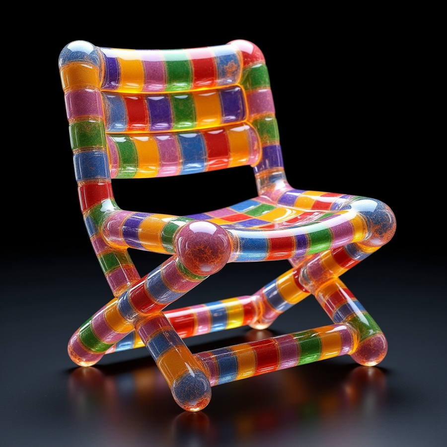 Для генерации коллекции была использована нейросеть Krea.AI. Был задан промт «folding multicolored chair made of rectangular panels» и выбран стиль генерации «glass art», впоследствии, отобраны вариации.