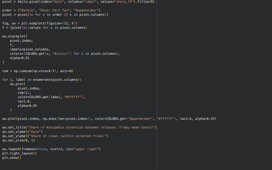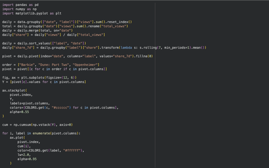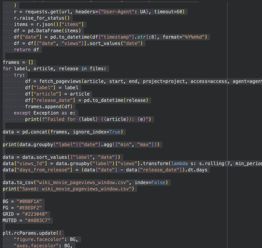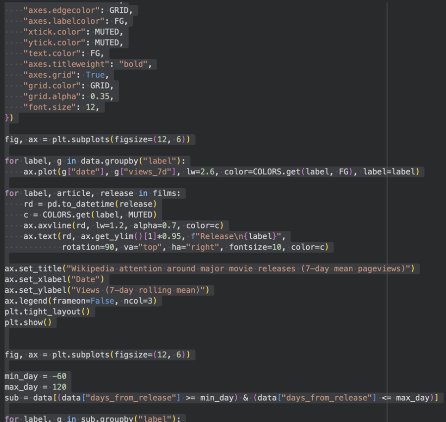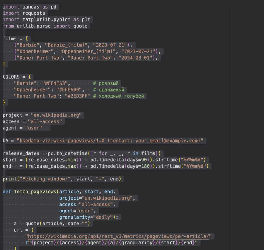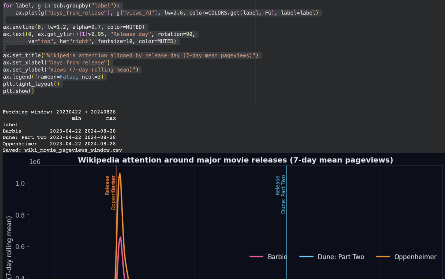 1. Выбор темы и постановка вопросов 2. Сбор данных: выгрузила дневные просмотры статей Википедии по выбранным фильмам через Wikimedia Pageviews API и собрала единый датасет. 3. Преобразовала даты, объединила данные в таблицу дата × фильм, задала окно анализа вокруг релизов и добавила переменную days_from_release. 4. Посчитала 7-дневное сглаживание (rolling mean), долю внимания между фильмами, агрегацию по месяцам, а также суммарные просмотры в первые 30 дней после релиза. 5. Построила набор графиков разных типов. 6. Привела графики к единому инфографическому стилю.