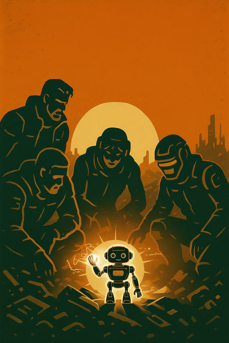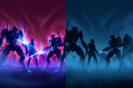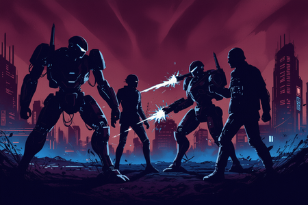 • Сгенерируй в этом же стиле изображение киберпанк войны, где воюют роботы. цвета поменяй на темно бордовые и синие • Сгенерируй изображение микро чипа с информацией в этом стиле киберпанка и используя цвета с изображения референса. • Сгенерируй мне это же изображение, только вместо кибер-импланта руки там мини робот • Сгенерируй изображение коробки настольной игры с названием Crome Slums
