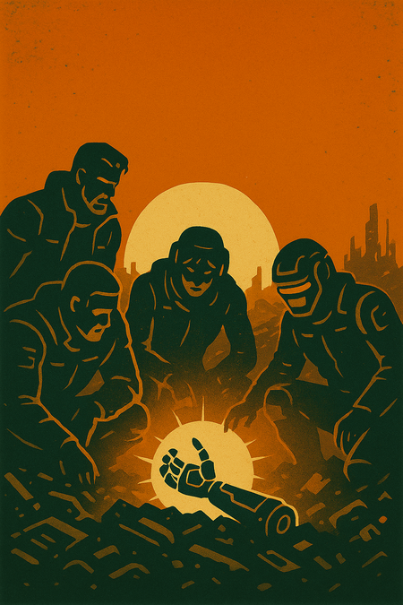 • Проанализируй данный стиль и создавай следующие картинки на основе данного изображения сохраняя цвета, формы, шум и прочие особенности данной работы • Сгенерируй изображение, как 4 человека, в одежде стиля киберпанк, исследуют свалку с 5ю кибер верблюдами как на фото референсе • Сгенерируй изображение 4к3 как эти люди находят на этой мусорке крутой имплант для руки • Сгенерируй в таком же стиле горизонтальное изображение как эти люди чинят своих кибер верблюдов • Сгенерируй горизонтальное изображение как эти люди копаются в мусоре с помощью металлоискателей • Сгенерируй горизонтальное изображение как эти люди перемещаются вместе со своими кибер верблюдами по мусорке (у каждого человека лежит правая рука на верблюде)