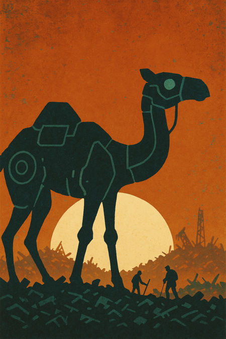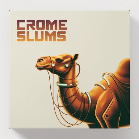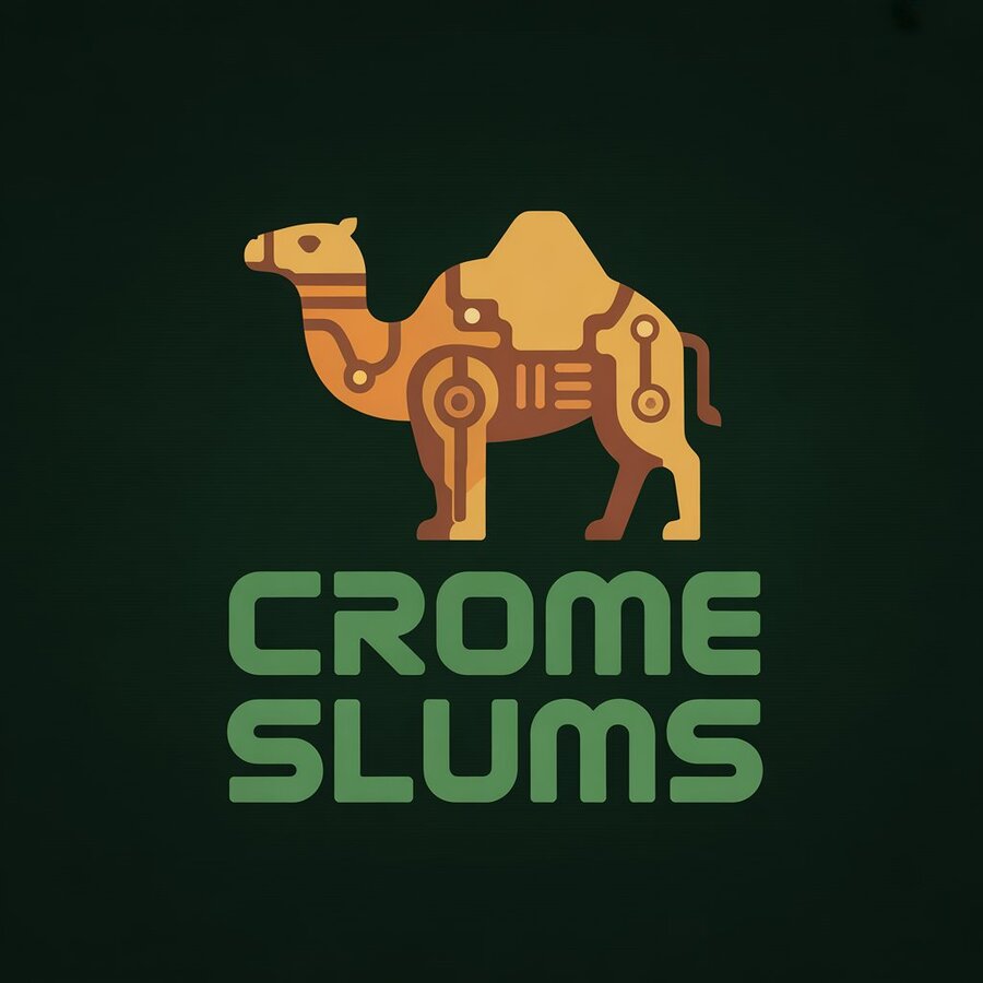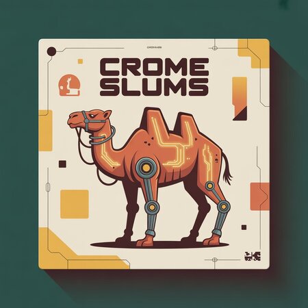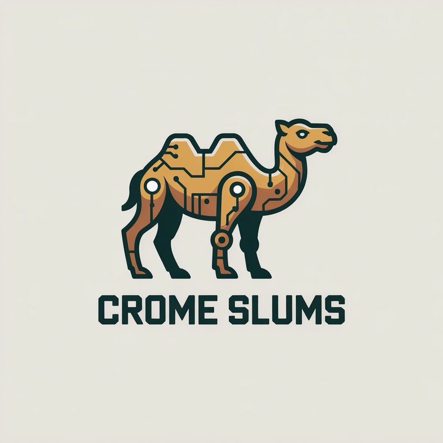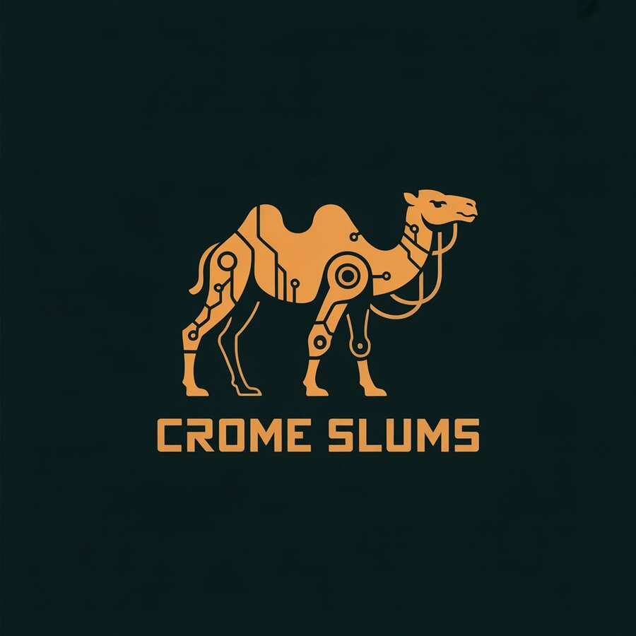 • Generate a minimalist logo for the board game «Crome Slums.» The game revolves around a group of people scavenging through trash in search of valuable items in a cyberpunk world. The logo should be minimalist and feature a cybernetic camel covered in implants.