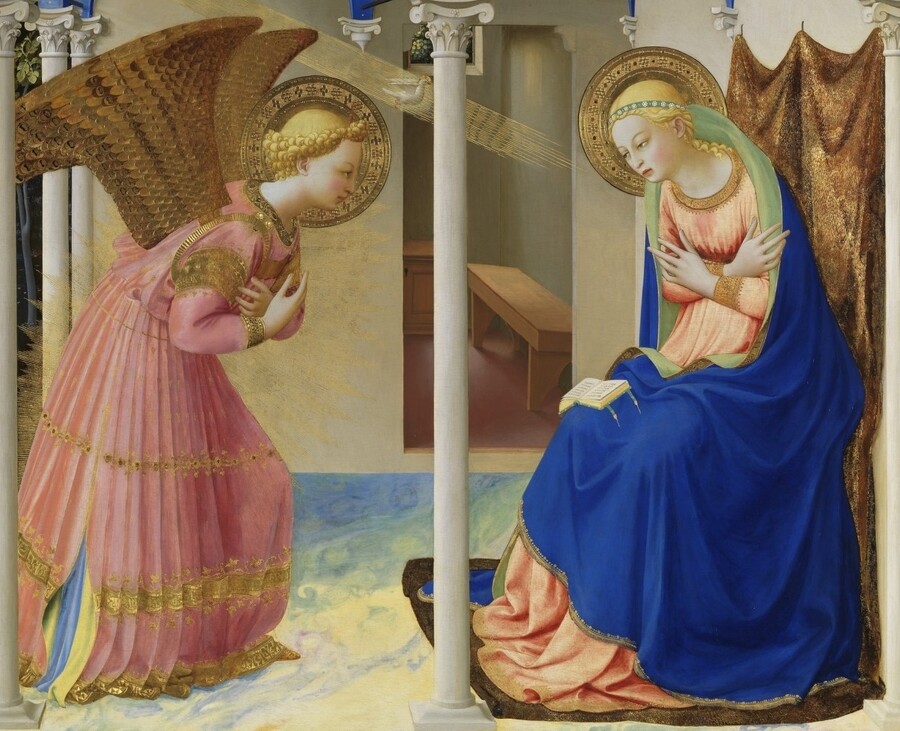 Интересно, что ранние алтарные образы Фра Анджелико трактуют ту же сцену Благовещения совершенно иначе по колориту, но достигают сходного мистического эффекта. В написанном около 1426 года алтарном образе для монастыря Сан-Доменико (ныне в музее Прадо) Ангел и Мария помещены под резной мраморный портик на фоне сверкающего золотого неба. Архангел Гавриил облачен в сияющие розово-золотые одежды, его фигуру ореолом окружает тончайшее сияние — игра света на сусальном золоте. Деву Мария художник, напротив, одел в глубокий ультрамариновый мафорий — самый дорогой пигмент того времени, символ небесной чистоты.