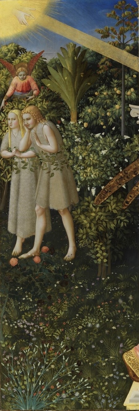 В левой части картины Анджелико добавил драматическую виньетку: изгнание Адама и Евы из Эдема. Их обнаженные фигурки, написанные в приглушенных, мутноватых тонах, покидают райские врата, сопровождаемые пламенеющим ангелом правосудия. Этот эпизод оттеняет сияющую центральную группу Благовещения.