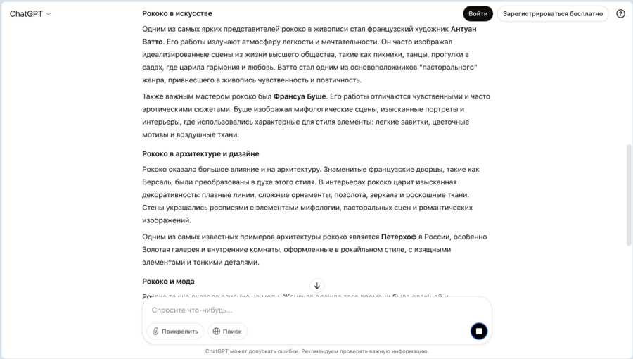 Самое болезненное в этом процессе — наблюдать эволюцию собственных промптов от ужасных к рабочим. Мой первый промпт был просто катастрофическим: «Напиши статью о рококо для Дзена». ChatGPT выдал академический текст, который был абсолютно непонятен обычным читателям. Стиль сухой, термины не объяснены, никакой связи с современностью.