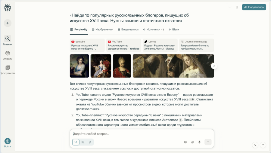 Поиск конкурентов через ИИ стал отдельным приключением. Я попросила Perplexity: «Найди 10 популярных русскоязычных блогеров, пишущих об искусстве XVIII века. Нужны ссылки и статистика охватов». В результате нейросеть предоставила мне список различных каналов, которые ведут как блогеры, так и различные организации. Но точных данных статистики Perplexity не смог найти.