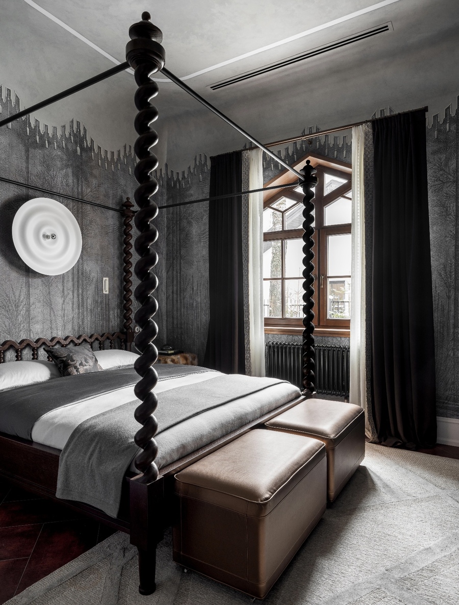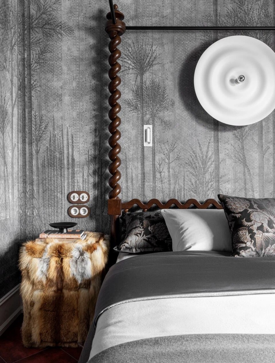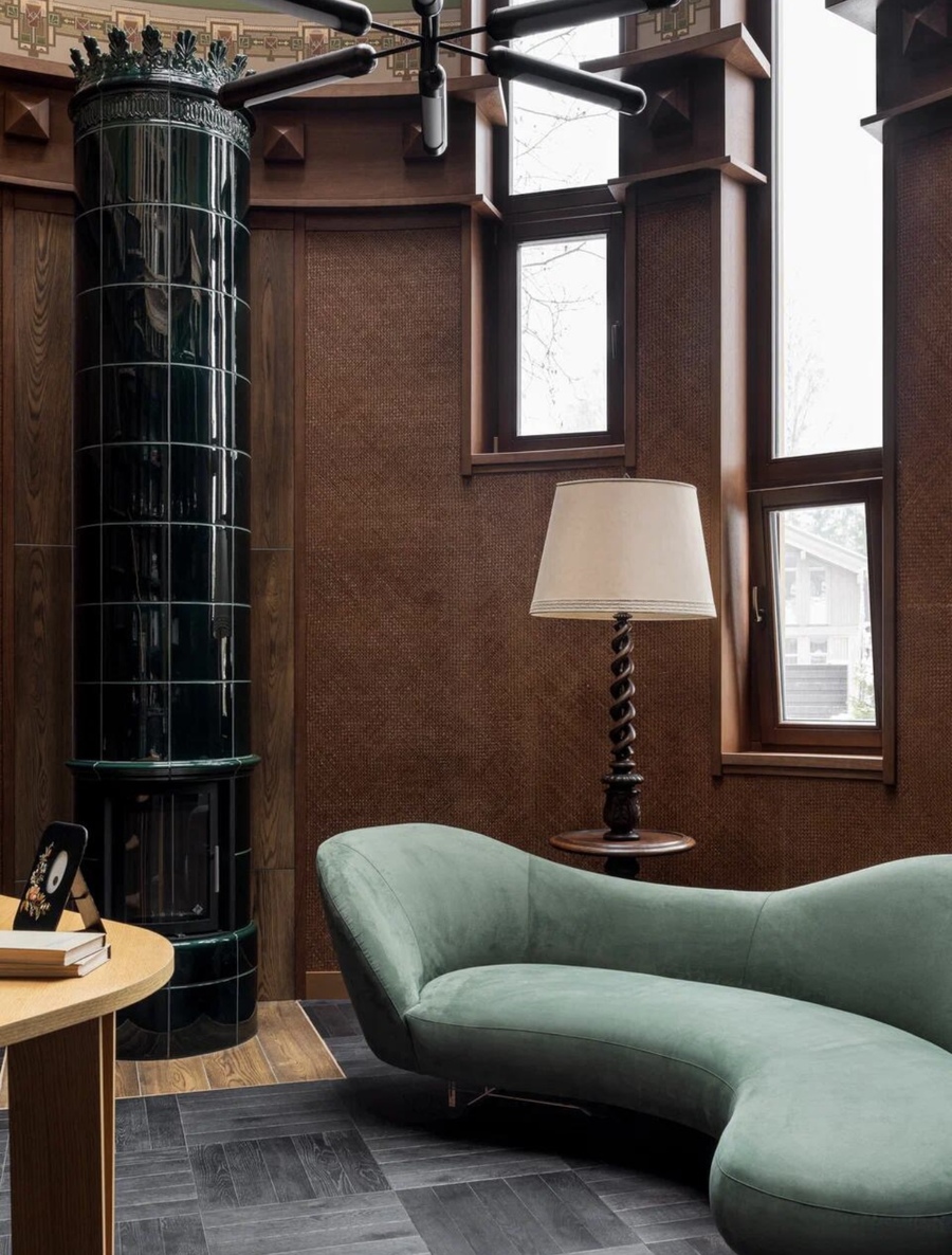 The house is located in the Dmitrovsky district of the Moscow region, in an incredibly beautiful and quiet place, far from civilization. This is the second building on the site and it is a guest building. My love is to combine the incompatible, to create history outside of tradition and make it impossible to implement — so there is less competition! This house is filled with quotes — the ornaments of Charles Mackintosh and Armand-Albert Rateau are combined with Russian Art Nouveau and ethnics. Since I was also responsible for the architecture of the house, I decided to make it one-story, so as not to contradict the natural beauty of the environment. Large windows, frames, which were implemented according to the author’s sketches, inspired by the shape of the architect Melnikov’s own house.