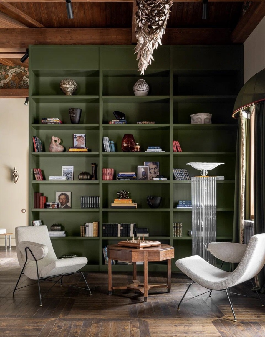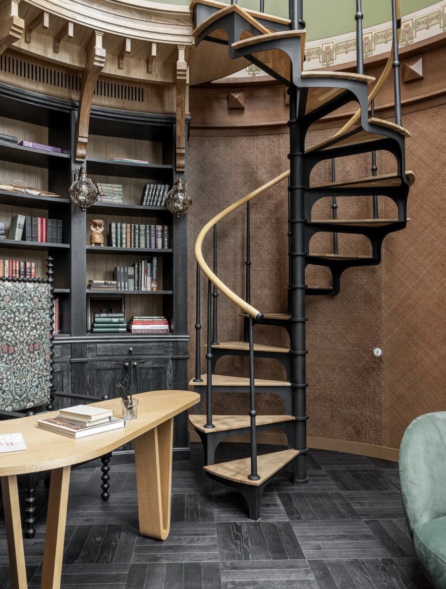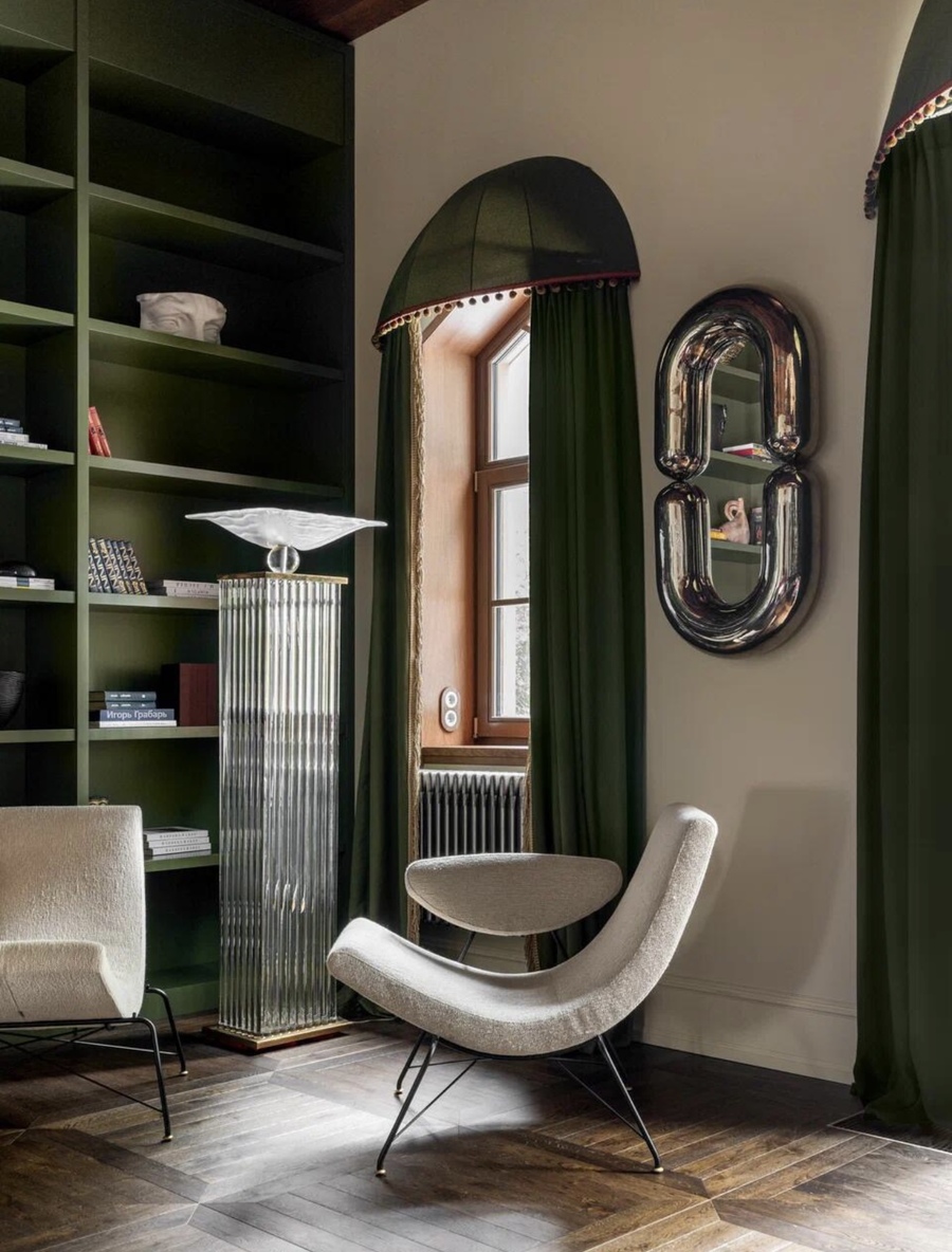 The house is located in the Dmitrovsky district of the Moscow region, in an incredibly beautiful and quiet place, far from civilization. This is the second building on the site and it is a guest building. My love is to combine the incompatible, to create history outside of tradition and make it impossible to implement — so there is less competition! This house is filled with quotes — the ornaments of Charles Mackintosh and Armand-Albert Rateau are combined with Russian Art Nouveau and ethnics. Since I was also responsible for the architecture of the house, I decided to make it one-story, so as not to contradict the natural beauty of the environment. Large windows, frames, which were implemented according to the author’s sketches, inspired by the shape of the architect Melnikov’s own house.